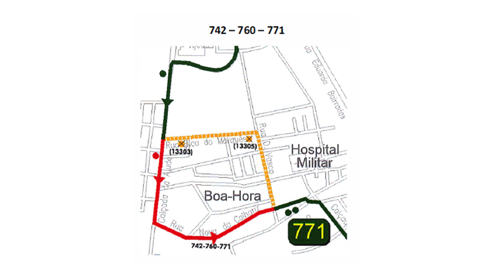 771 (sentido Boa-Hora) | a partir da Cç. Ajuda via R. Amoreiras à Ajuda e R. Nova Calhariz onde efetua o seu terminal.