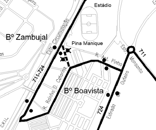 As carreiras 711 e 724 circulam, em ambos sentidos, via Estr. Circunvalação, R. Rainha D. Catarina e R. António Pinho onde retomam os seus percursos.