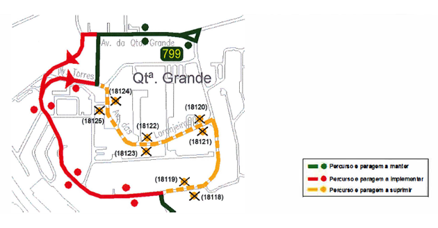 Serão implementadas paragens provisórias ao longo da Av. Qta. Grande e na Tv. Torres, em localização próxima às paragens do outro operador.