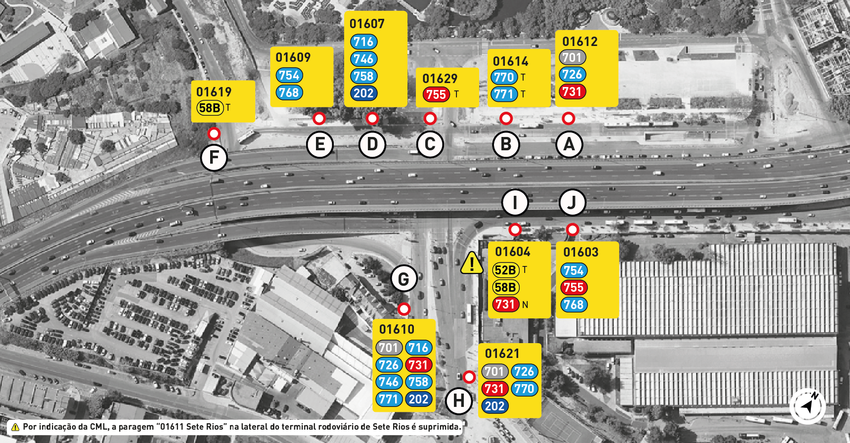 A partir do dia 13 de maio de 2025 (3.ª feira), as paragens da interface de Sete Rios serão reordenadas, conforme o esquema abaixo.