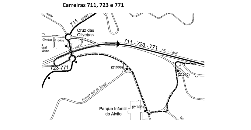 711, 723 e 771 | sentido centro da cidade, circulam, a partir da rotunda Cruz Oliveiras, via A5 para as Amoreiras.