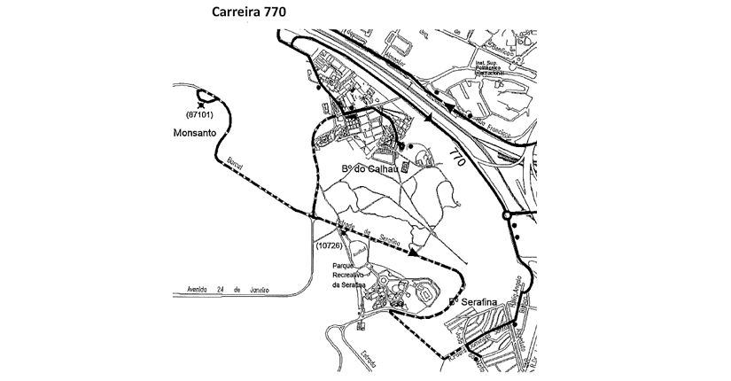 770 | efetua o percurso habitual até ao B.º Calhau, inverte e segue via radial de Benfica até à rotunda da Serafina, passa pelo B.º Serafina onde retoma o seu percurso para Sete Rios.