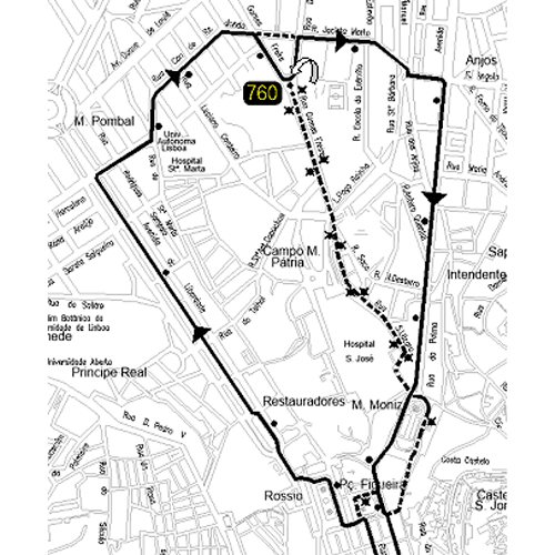 A carreira 760, sentido Gomes Freire, circula via R. Prata, Pç. Dom Pedro IV, Pç. Restauradores, Av. Liberdade, R. Alexandre Herculano, R. Conde Redondo e R. Gomes Freire, onde efetua terminal, provisoriamente, junto ao terminal da carreira 774 “06907 Gomes Freire”. Inverte sentido, seguindo via R. Dona Estefânia, R. Jacinta Marto, R. Febo Moniz, Av. Almirante Reis e Lg. Martim Moniz onde retoma o seu percurso.