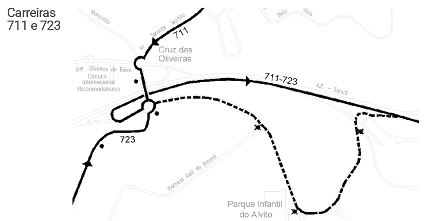 - 711, sentido Terreiro Paço, circula via Av. Tenente Martins, Cruz das Oliveiras, A5 e viaduto Duarte Pacheco onde retoma o seu percurso;