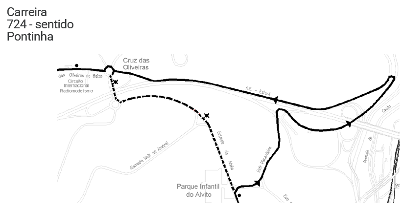 - 724, sentido Alcântara, circula via Cruz das Oliveiras, A5, saída Pç.Espanha/Av.Ceuta, saída Alvito, Estr. Pimenteira e Estr. Alvito onde retoma o seu percurso. No sentido Pontinha via Estr. Alvito, Estr. Pimenteira, saída Serafina/Estoril, A5, saída Monsanto e Cruz das Oliveiras onde retoma o seu percurso.