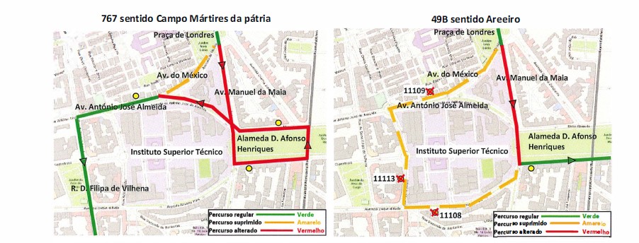- circula via Praça de Londres, Av. Manuel da Maia, Contorna Alameda D. Afonso Henriques, segue via Av. António José de Almeida, onde retoma
