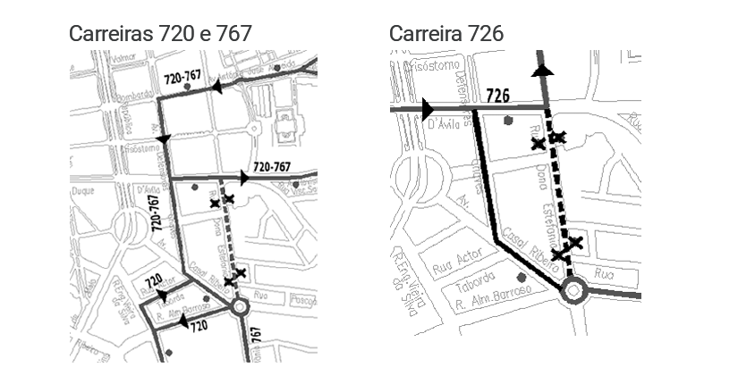 - A carreira 726 circula em ambos sentidos via Av. Duque Ávila, Av. Defensores Chaves e Av. Casal Ribeiro.