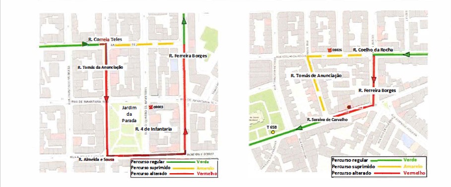 - Entre as 9h e as 12h, via R. Correia Teles, R. Tomás de Anunciação, Rua Almeida e Sousa e R. Ferreira Borges, onde retoma percurso;