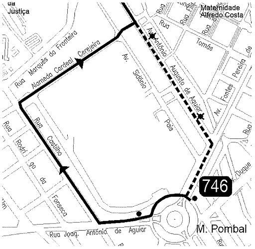 Neste período, a carreira 746, sentido Estação da Damaia, circula, a partir do terminal, via R. Joaquim António Aguiar, R. Castilho, Alameda Cardeal Cerejeira e Av. António Augusto Aguiar, onde retoma o seu percurso.