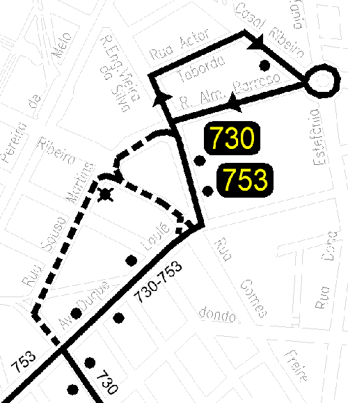 - A carreira 730 sentido Pç. José Fontana circula via R. Luciano Cordeiro, Av. Duque Loulé e Pç. José Fontana onde efetua terminal;
