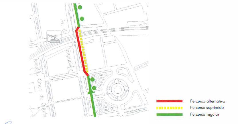 No dia 11 de setembro (sábado), entre as 8h e 13h, as carreiras 727, 736, 738, 744 e 783 circulam pela pela faixa central da Av. República, conforme esquema.