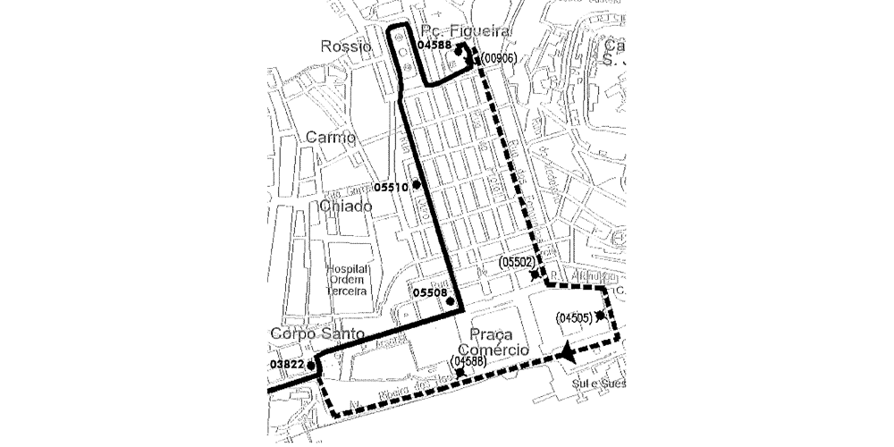 - Do terminal da Praça da Figueira segue via Rossio, R. do Ouro (onde efetua paragens), R. do Arsenal e Corpo Santo.