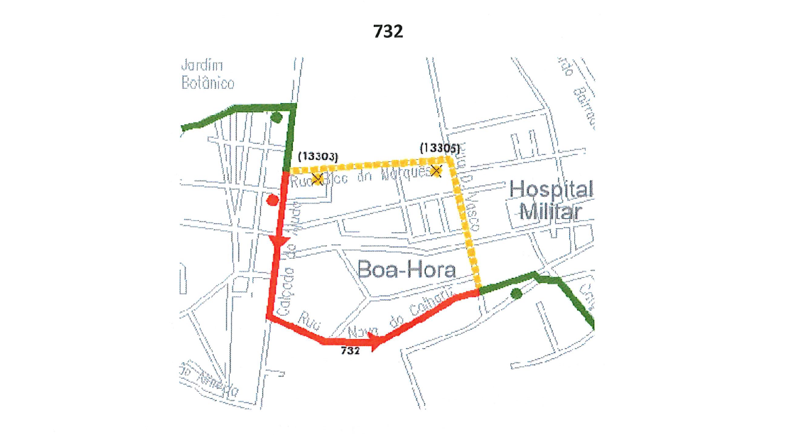 732 (sentido Hosp. Sta. Maria) | a partir da R. Jardim Botânico circula via Calçada da Ajuda, R. Amoreiras à Ajuda e R. Nova Calhariz, onde retoma o seu percurso.