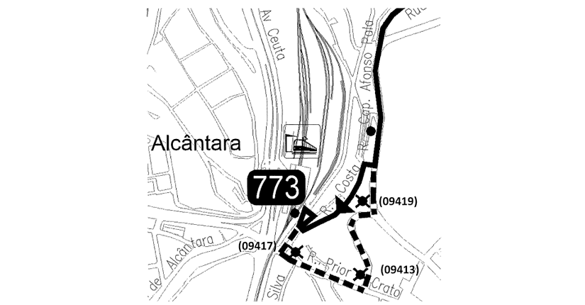 De 20 a 24 de março (2ªf a 6ªf), entre as 8h e as 17h, a carreira 773, sentido Alcântara, circula, a partir da R. Capitão Afonso Pala, via R. da Costa e R. Maria Pia, onde efetua terminal.