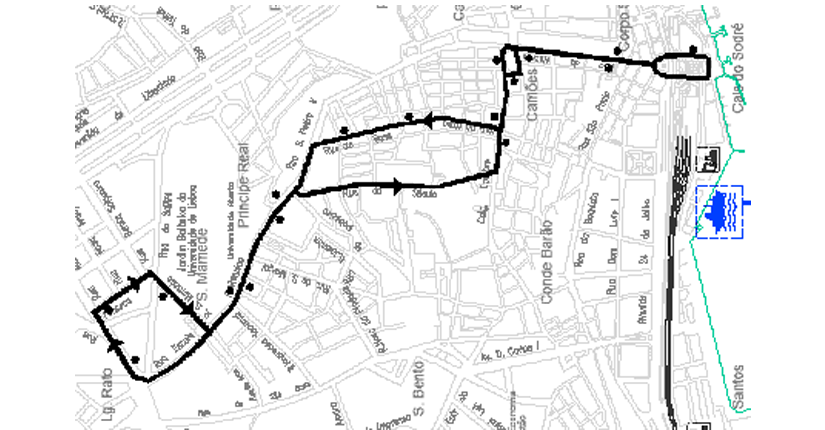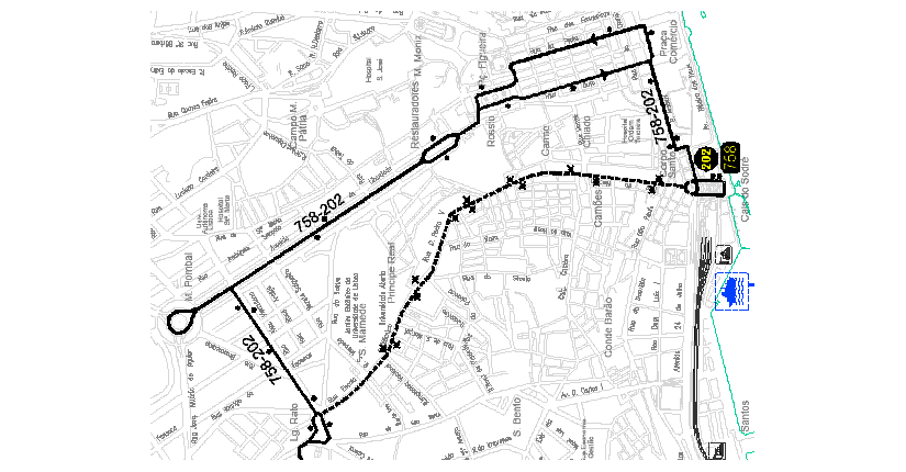 As carreiras 758 e 202 circulam, em ambos sentidos, via Lg. Rato, R. Alexandre Herculano, Av. Liberdade, Rossio, R. Ouro/R. Prata, R. Arsenal e C. Sodré.