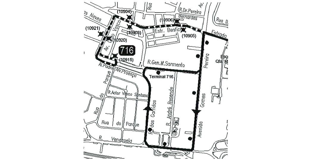 716 | via Av. Gomes Pereira e R. Garridas, efetuando terminal na R. General Morais Sarmento.