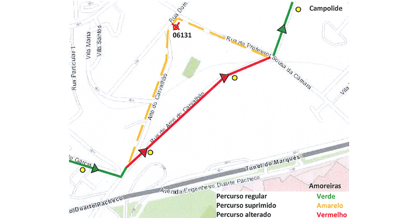 Circula a partir da R. Garcia via R. Arco Carvalhão e R. Campolide onde retoma o seu percurso, conforme esquema seguinte.