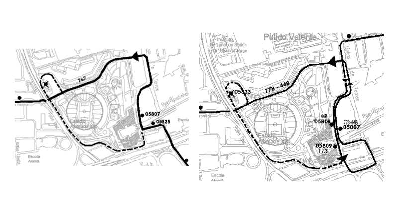 - A carreira 778, a partir do seu terminal do Campo Grande-Metro, e a carreira 44B, também a partir da R. Cipriano Dourado, circulam via topo norte do Jardim do Campo Grande, Al. das Linhas de Torres, R. Actor António Silva, R. Cipriano Dourado, Al. da Linhas de Torres, R. Francisco Stromp e R. Fernando Fonseca onde retomam o seu percurso.