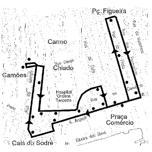 - com autocarros mini, entre a Pç. Figueira e Lg. Camões, via Pç. Comércio e percurso da carreira.