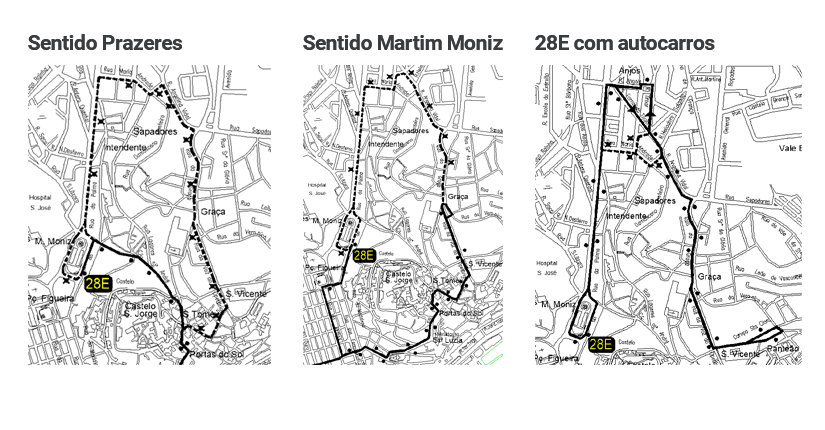 - no sentido Prazeres, via Lg. Martim Moniz fazendo o percurso da carreira 12E até ao Largo Portas do Sol, onde retoma o seu percurso;