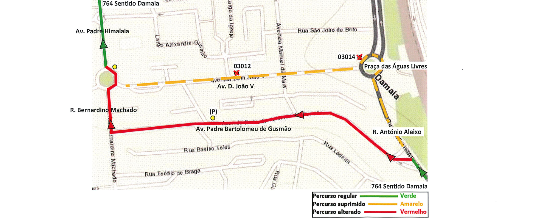 Nos dias 25 de agosto (6.ª feira) e 26 de agosto (sábado), entre as 8h30 e as 17h30, a carreira 764 (sentido Damaia Cima), circula via Av. Bartolomeu de Gusmão, R. Bernardino Machado, retomando na Praça Marquês das Minas, conforme esquema seguinte.