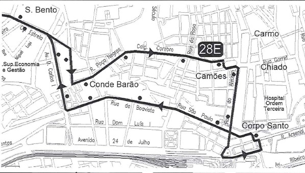 - No sentido inverso, via percurso da carreira até ao Lg. Camões.