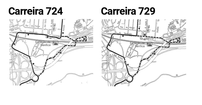 As carreiras 724 e 729, sentido Pontinha e B.º Padre Cruz, respetivamente, circulam via Estrada da Buraca, R. Issan Sartawi e R. da Venezuela.