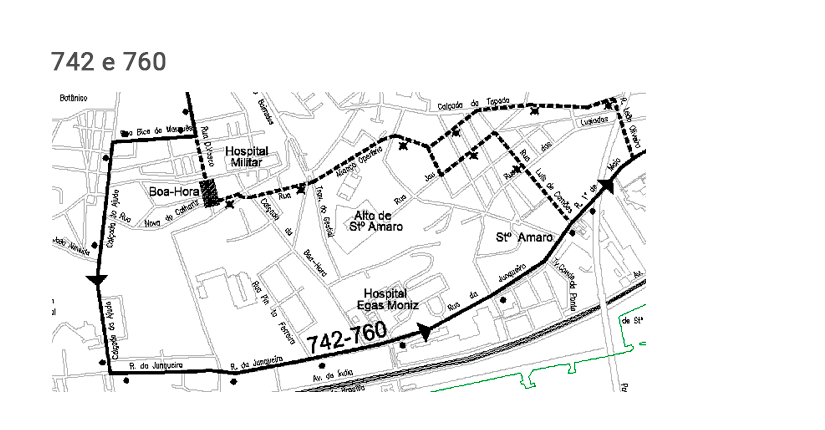 - 742 destino B. Madre Deus, a partir da R. Dom Vasco via R. Bica Marquês, Cç. Ajuda, R. Junqueira e R. 1º Maio onde retoma o seu percurso;