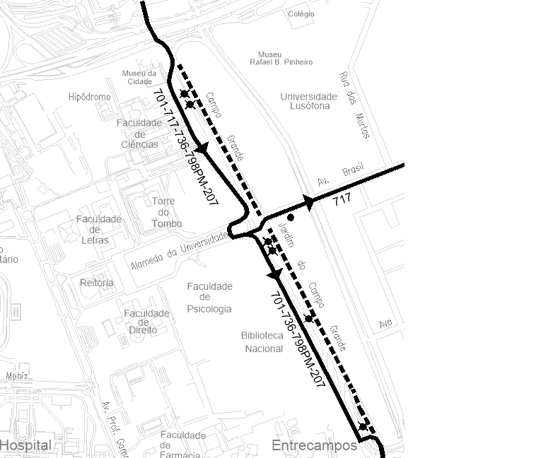 701, 736, 798 e 207 | circulam a partir do Campo Grande pela via lateral, Alameda Universidade e retomam a via lateral do Campo Grande até Entrecampos.